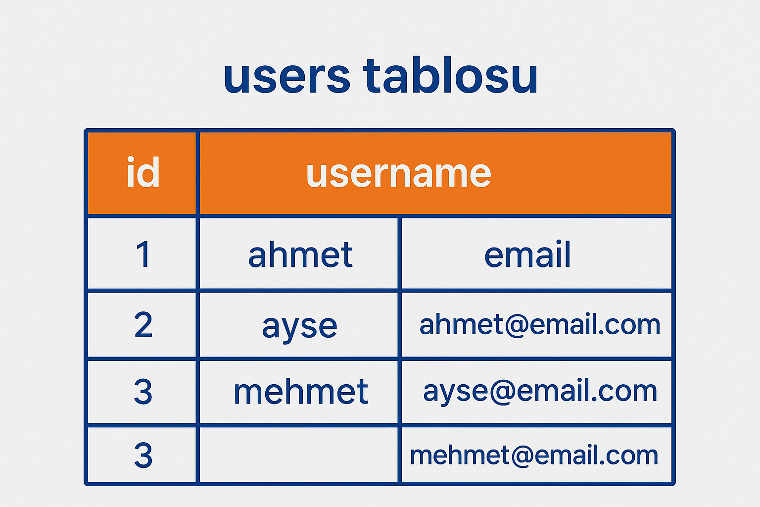 Tablodaki her bir veri alanı. Örnek: id, username, email